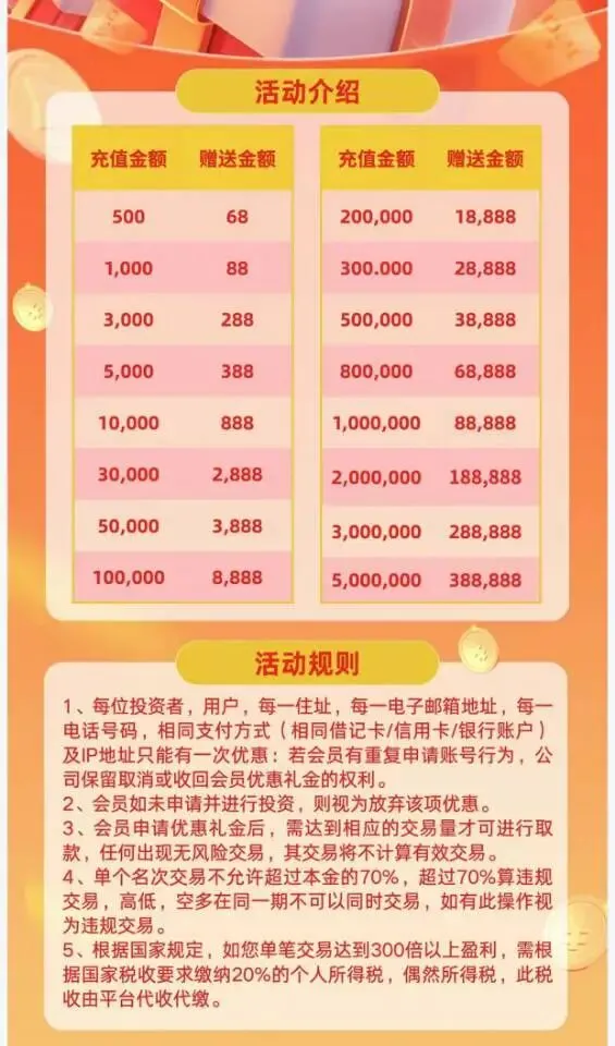 同时,活动规则中暗藏陷阱:要求“达到相应交易量才可取款”“单笔交易300倍以上盈利需缴纳20%个人所得税”“违规交易不予计算有效交易”。这些规则看似是平台的正常风控,实则是诈骗分子后续拒绝提现、冻结资金的借口。诈骗分子会不断催促被害人“趁活动多充点,收益翻倍”“错过这次就没机会了”,利用被害人“赚更多钱”的心理,诱导其投入大额资金。