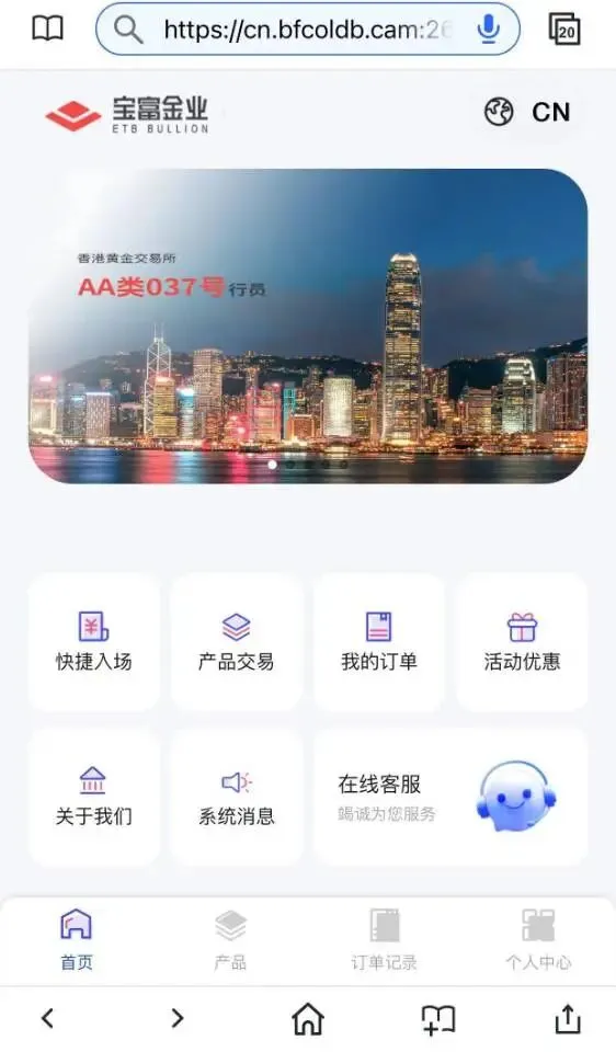 被害人提供的平台链接为https://cn.bfcoldb.cam:26082,页面显示“宝富金业(ETB BULLION)”,声称是“香港黄金交易所AA类037号行员”,但该平台存在多处致命疑点: