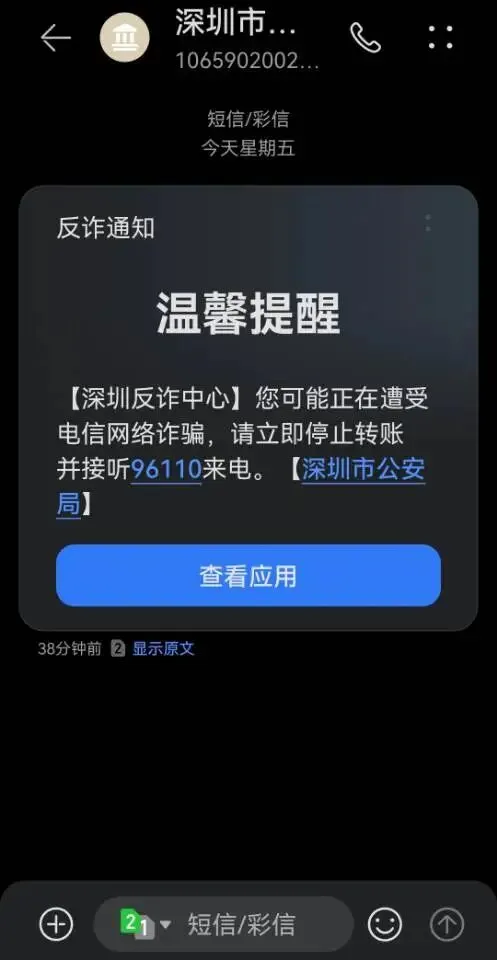 被害人收到的【深圳反诈中心】短信通知,是公安系统针对电信网络诈骗的精准预警。短信明确提示“您可能正在遭受电信网络诈骗,请立即停止转账并接听96110来电”,这是公安部门通过大数据监测到被害人的资金流向、平台链接存在诈骗风险后发出的预警,也是被害人意识到被骗的关键信号之一。