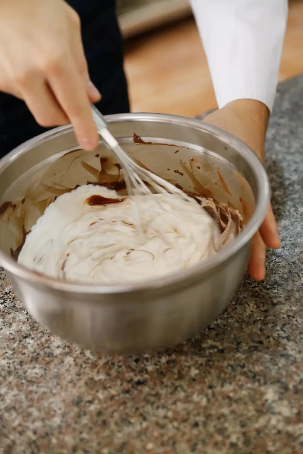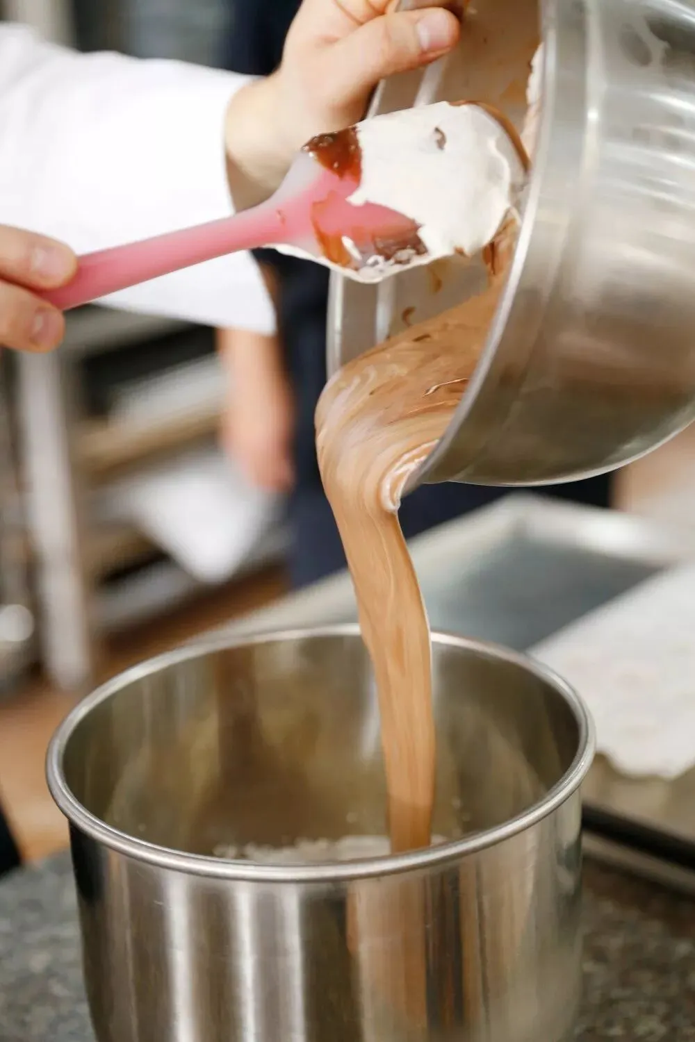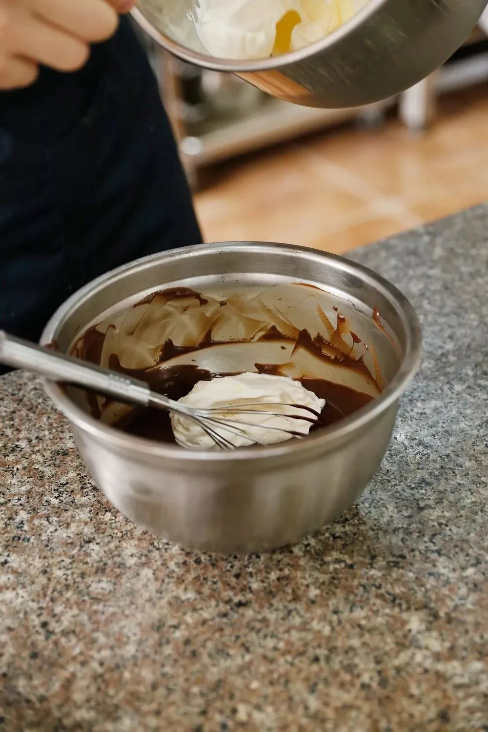 1、将淡奶油和焦糖牛奶巧克力放入微波炉加热溶化,温度降至35℃时加入打发淡奶油;蛋白和幼砂糖打至中性发泡,然后和淡奶油部分一起混合完全。配方: