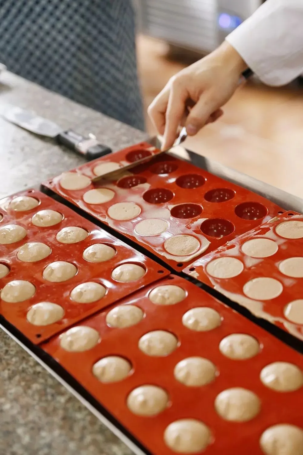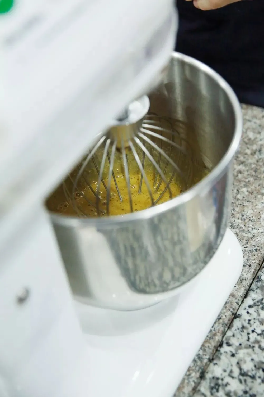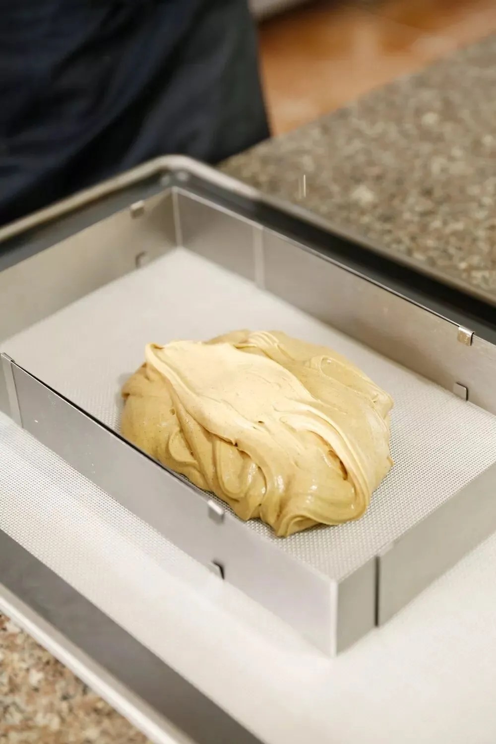 1、将淡奶油和焦糖牛奶巧克力放入微波炉加热溶化,温度降至35℃时加入打发淡奶油;蛋白和幼砂糖打至中性发泡,然后和淡奶油部分一起混合完全。配方: