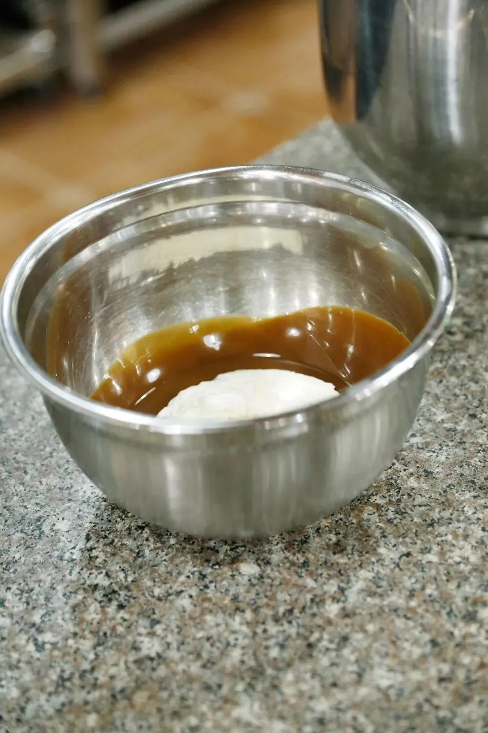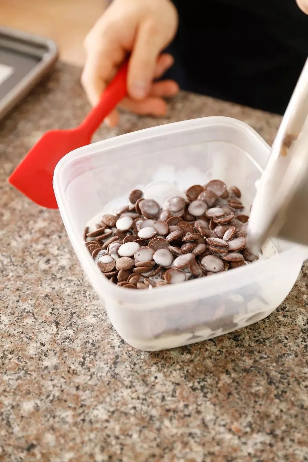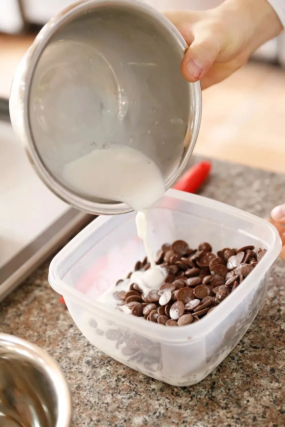 1、将牛奶和考维曲牛奶巧克力微波炉加热溶化,温度降至35℃时分次加入打发淡奶油,混合均匀后挤入直径3厘米小圆球模具中,冷冻。1