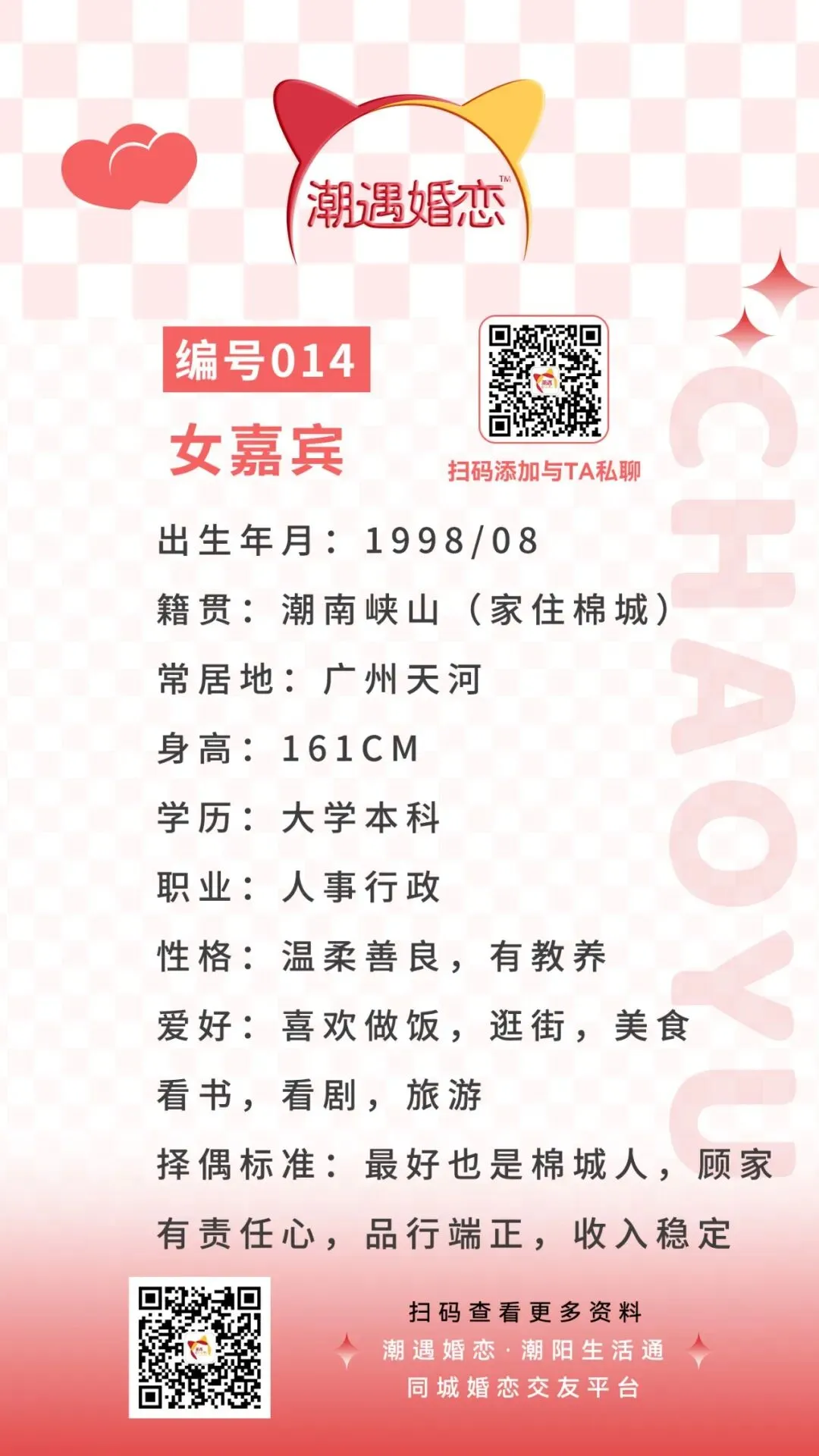 诚意想与嘉宾认识的可扫码联系潮遇红娘牵线,将本期嘉宾的编号/交友卡片发送给潮遇红娘,开启心动模式,与嘉宾微信聊天深入了解哟!