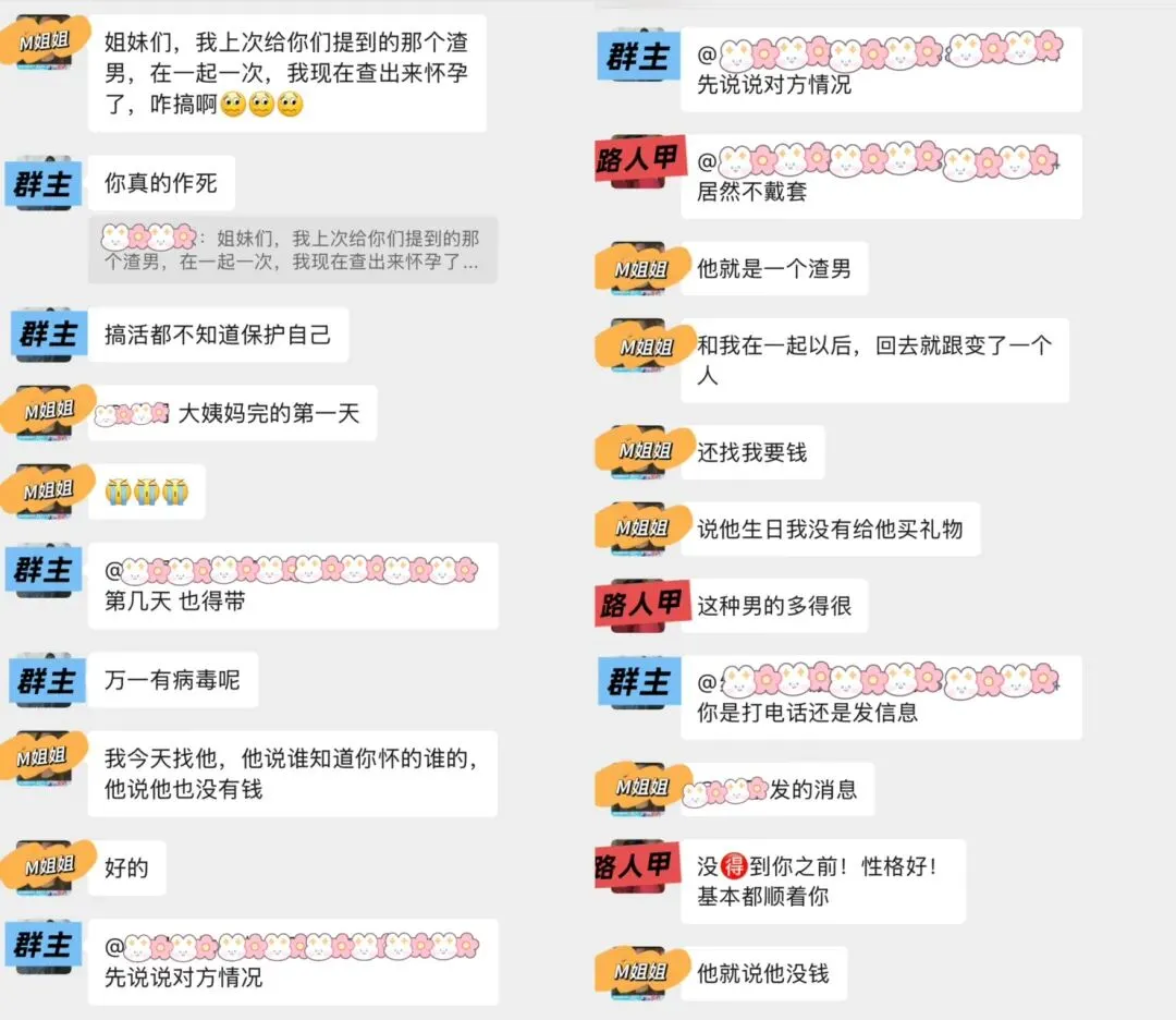我曾经加入一个姐妹群,里面都是天南地北不认识的女孩子们,大部分都是遇到一些情感问题,然后报团取暖。大家把自己遇到的问题发到群里,大家群策群力(七嘴八舌)一下,群主小姐姐披着斩男小能手的人设也会下场指导指导,甚至付费代聊。