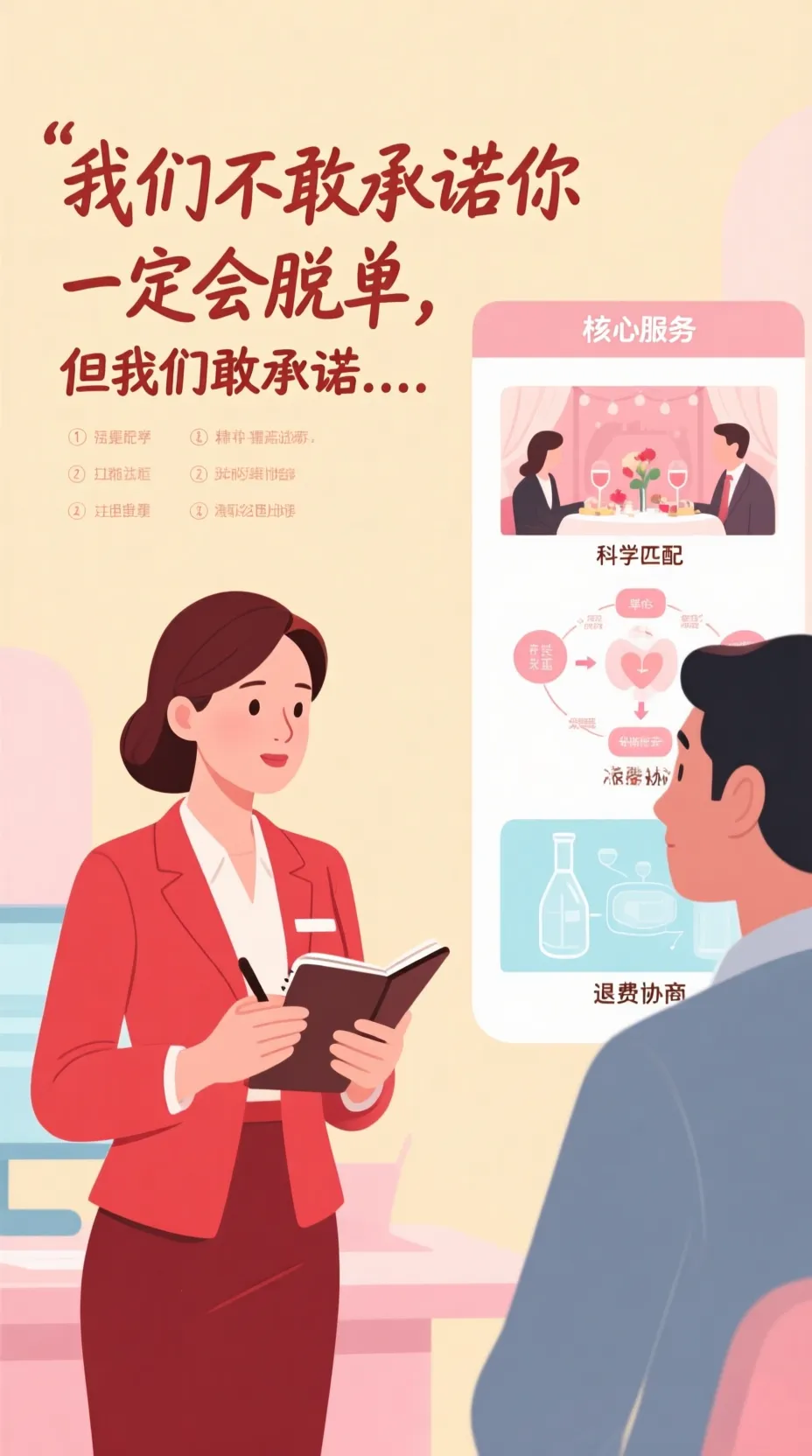 明确责任:如果是匹配质量问题、服务不到位,我们会承担责任合理退费:按照实际服务进度和问题严重程度,给予公平的退费方案①“没有感觉”不等于服务失败
