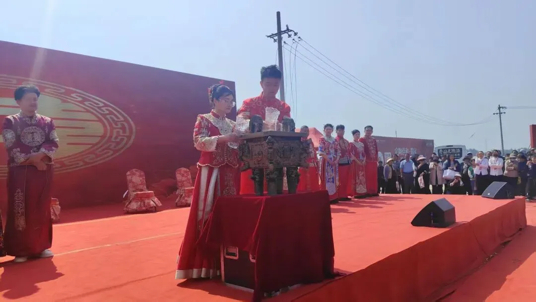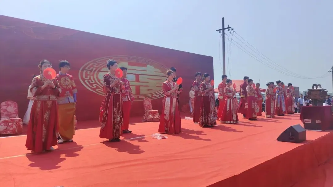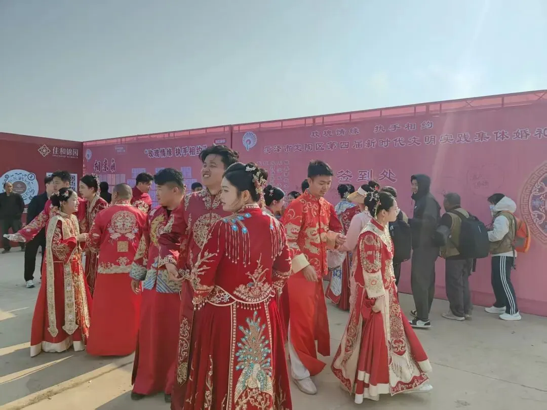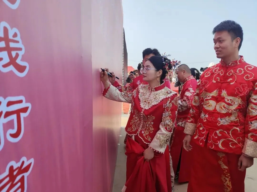 在喜庆的舞台上,新人们身着中式礼服,依次完成礼仪环节,以庄重简约的仪式,践行婚事新办、文明节俭的新风尚。同时为参与集体婚礼的新人送上了精心准备的纪念礼品,承载着对新人百年好合、永结同心的美好祝愿,也向全社会传递了文明婚恋、健康生活的价值导向。